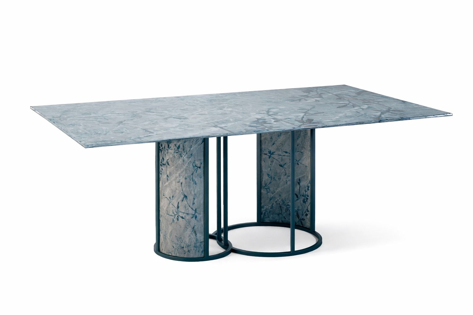Tavolo King KI.RT., forma rettangolare di differenti misure, con bordi arrotondati, con top in cristallo stampato (grafica a scelta) e gamba doppia grande in metallo verniciato in RAL e microlamina stampata con grafica a scelta, diametro variabile 35/40cm+48/58cm H 74cm